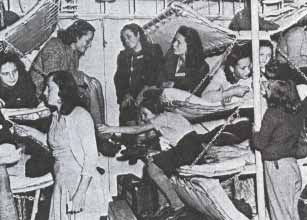 When we found her, Mom made a valiant effort to act as if it were no big deal to have to stand aside while four sailors carried off a coffin draped in an Italian flag. Plague? A mutineer, flogged to death? I never did find out what happened to the sailor, but starvation would have been a reasonable guess: there was very little food available even for passengers, and what there was, was almost inedible even for hungry teenagers. We slept in three-decker bunks, about 200 to a “room” (cargo hold, really). We were segregated by sex, of course, but not by susceptibility to seasickness, which would have been more useful. It was sometimes very rough.
