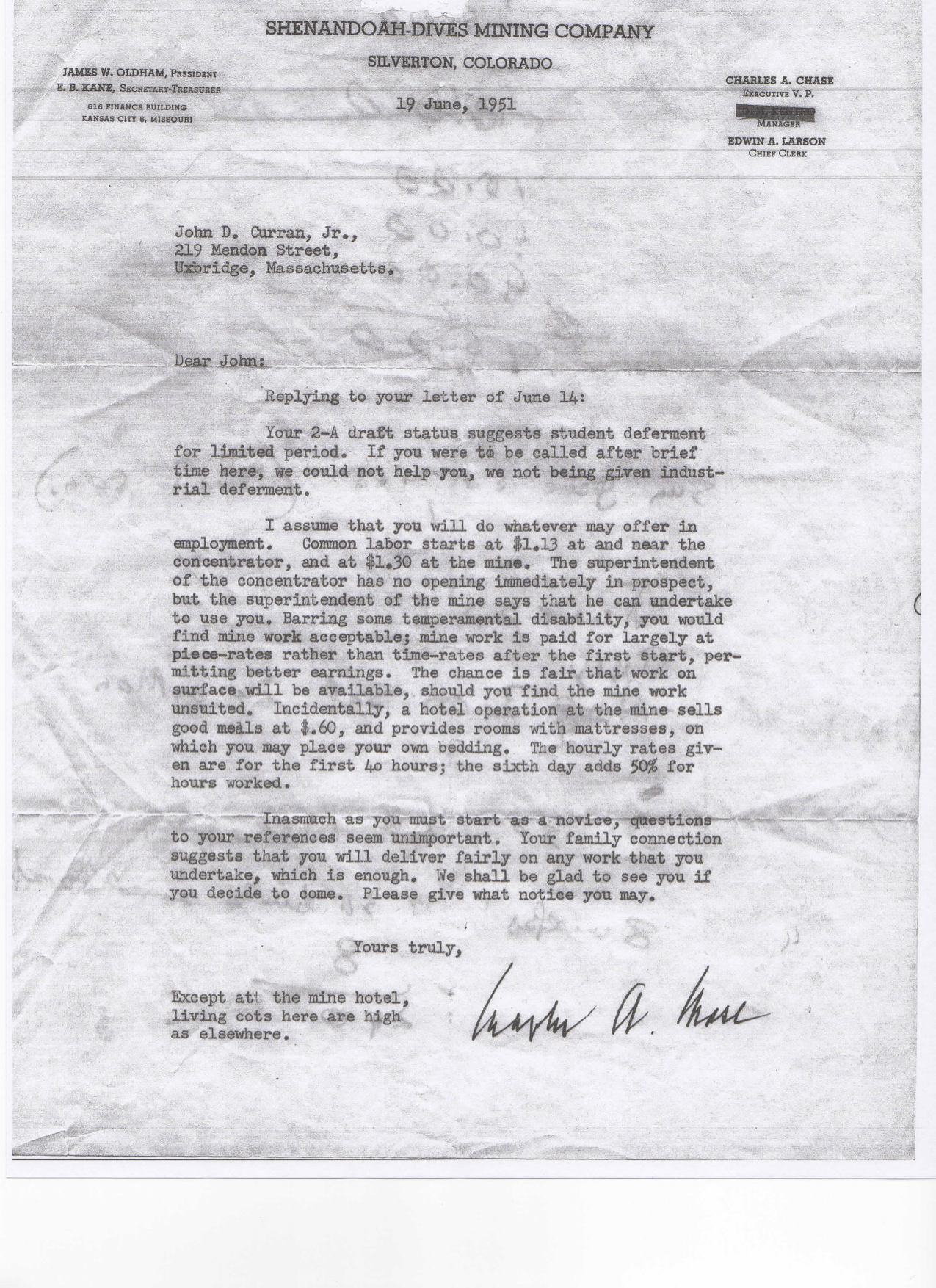 Charles Chase, the mine owner, was a friend of our grandparents, and in 1951 he offered Jadie a summer job. His letter includes details of interest to those who remember or study the 1950s. Along with particulars of pay scale and housing (single miners were required to live in the mine “hotel”), he commented on draft deferment, reminding us that young men were then subject to be drafted to fight in Korea.