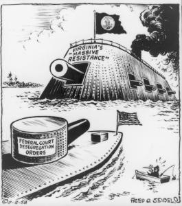 As Senator Kaine acknowledged, reactions to Brown I and II in his home state were especially complex, creative, and – in the long run – devastating to thousands of children. Virginia Senator Harry F. Byrd, Sr. controlled the Democratic machine that dominated Virginia politics for much of the first half of the 20th century, and on the very day that Brown was announced, Byrd called the decision “the most serious blow that has yet been struck against the rights of the states.” The senator led what became a movement of “Massive Resistance,” but he did not work alone. The Richmond News Leader and other papers preached fierce opposition to desegregation, writing in a spirit of furious resentment of the Court’s interference with established custom, local mores, and what they defined as the will of Virginians (white Virginians, needless to say). Some News Leader editorials sounded more like the 1850s than the 1950s: “States’ Rights” was the mantra of Resistance, bolstered by revival of the old notion of “interposition” – the insistence that states had the right and the duty to “interpose their sovereignty” between their own people and the federal government. In 1956, the Virginia legislature pledged to “resist this illegal encroachment upon our sovereign powers… the reserved powers of the states.”