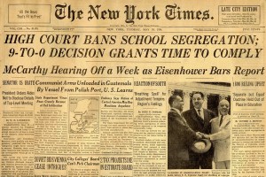 Most Americans know that the May 1954 Supreme Court decision in Brown v. Board of Education of Topeka ended de jure segregation in public schools. However, much of what happened in the following years may have been forgotten except by old-timers, American historians, and Virginians such as Senator Kaine. The Court’s announcement of the Brown decision was what we might today call Real News; it had been a long time coming. From many parts of the country, including my perch in college in New England, cheers went up from those who recognized the abysmal failures of “separate but equal” as established by Plessy v. Ferguson, the infamous 1896 case that legalized racial segregation.