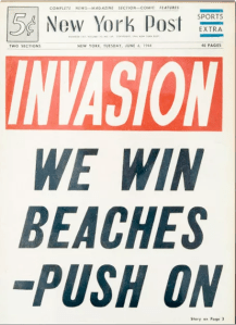 This post began as a slight, eccentric, but (for me) unforgettable glimpse of June 6, 1944—a child’s hazy memory of an impossibly long-ago time. I’m afraid it has become just another bitter reminder of what has happened to our country. In the course of thinking about D-Day, I looked at some old newspapers. The headlines and accompanying photographs reveal the breathless anticipation of what “we”—and there was a “we” then, at least on that day—expected would hasten the end of a devastating war. Desperate fear for the soldiers accompanied passionate hopes for victory and peace. It was long, long ago, and very unlike our own selfish and divided moment.