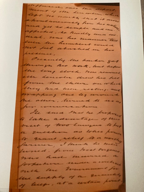Longhand version of the Lincoln anecdote, above: “Presently the barber got through his work, but before the long cloak was removed, Mr Lincoln drew his feet from the chair on which they had been resting, and wrapping one leg around the other, turned to us as for conversation…”