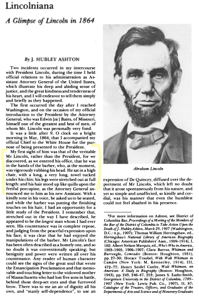 My great-grandfather, Joseph Hubley Ashton, was a 19th-century lawyer and a powerful voice for birthright citizenship as a pillar of United States immigration policy. He was also an admirer of Abraham Lincoln and a friend of Walt Whitman, but I knew nothing about him until I learned about a family treasure inherited by my mother — his account of a highly informal meeting with President Lincoln. As a young Assistant Attorney General during the Civil War, Ashton was taken by the Attorney General to be introduced to the Commander-in-Chief. During their meeting, the president was “in the hands of the barber… his legs were stretched out at full length, and his hair stood up like quills upon the fretful porcupine.” The text, an endearing account of the Great Emancipator at ease and enjoying the company of fellow-lawyers, was published in the Journal of the Illinois State Historical Society (Vol. 69, No. 1, Feb., 1976) and is posted here and at left/above.