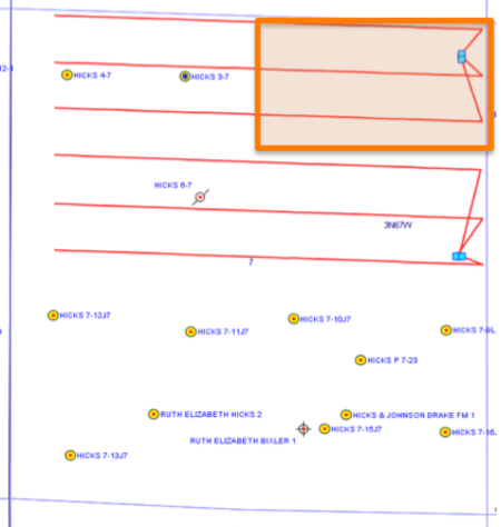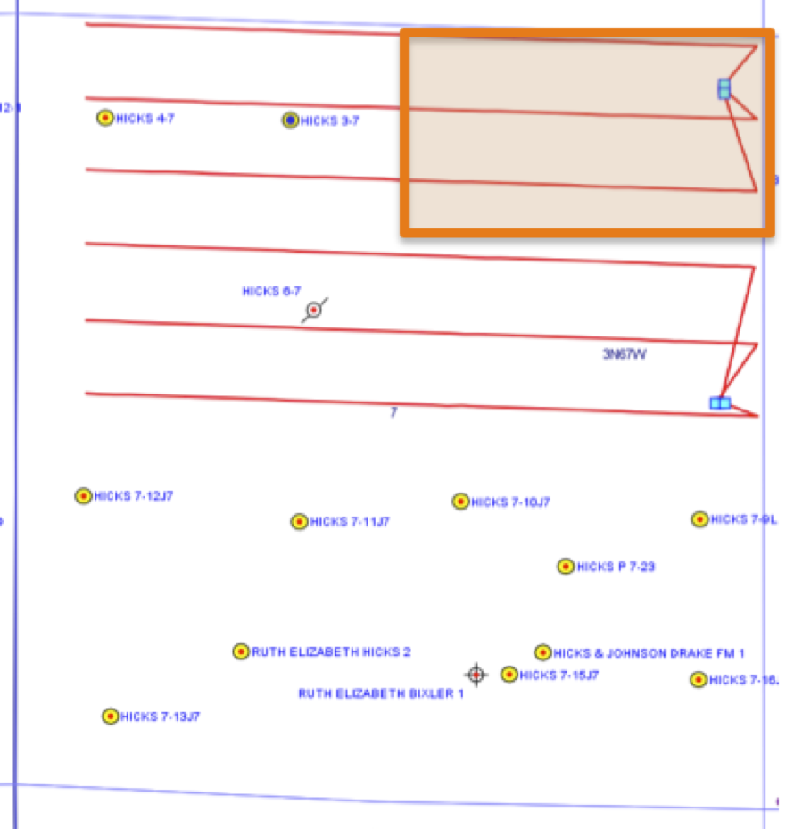 The graphic is a map from the State of Colorado gas and mining GIS website. The blue lines nearest the edges of the graphic enclose a section =~ square mile = 640 acres, located in Weld County, CO. (The land is located about 40 miles due north of Denver, on the flats, perhaps 20 miles from where the land starts rising toward the front range of the Rockies.)